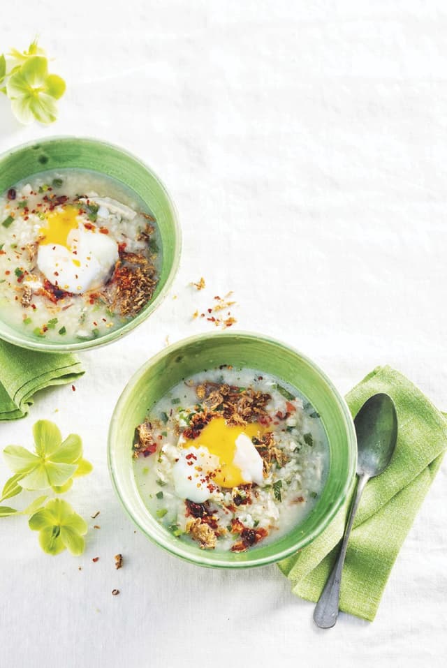 BEREIDING Was de sushirijst. Kook de rijst volgens de aanwijzingen op de verpakking. Verhit de rijstazijn met het zout en schenk bij de gekookte sushirijst. ● Breng een pan met water aan de kook. Haal dan de pan van het vuur, leg er de eieren in en laat 14 minuten staan. Pocheer ondertussen de kipfilets 10-12 minuten in zacht kokend water met zout en de limoenblaadjes. ● Verhit de olie in een grote hapjespan en fruit de knoflook, het witte deel van de bosui en de gember zo’n 3-4 minuten. ● Schenk er de kippenbouillon bij en roer de sushirijst erdoor. Snijd de kip in reepjes, schep in de pan en rasp de kruidnagel erboven. Roer de rest van de bosui en koriander erdoor. ● Schep de congee in voorverwarmde brede kommen. Breek de eieren in het midden van de soep en garneer met de crispy sjalotten en chiliolie.