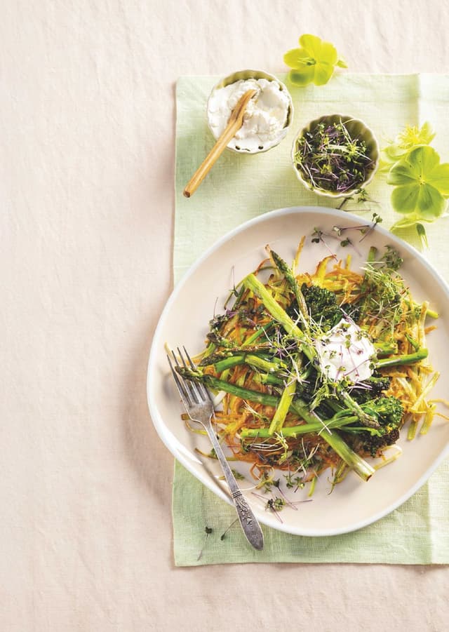 RÖSTI MET GEBLAKERDE GROENE ASPERGES EN BIMI