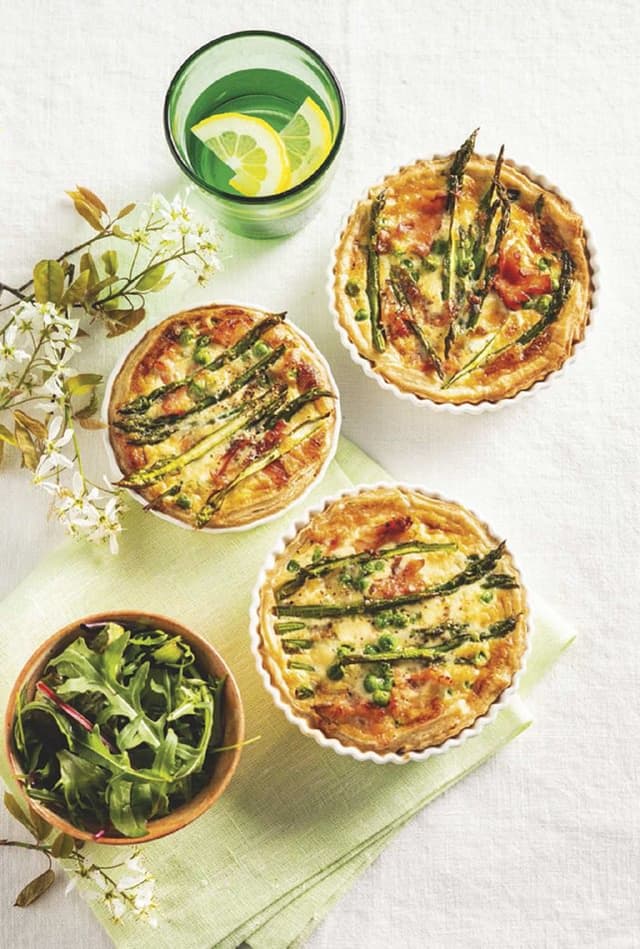 BEREIDING Verwarm de oven voor tot 185°C. Bekleed een ingevette quichevorm met het speltdeeg en prik met een vork gaatjes in de bodem. Leg bakpapier op het deeg, vul met blindbakbonen en bak 13-15 minuten in de voorverwarmde oven. ● Laat, eenmaal uit de oven, iets afkoelen en verwijder de bonen en het bakpapier. Verdeel de zalmflakes, doperwten en aspergetips over het deeg. ● Klop in een kom de eieren los met de slankroom en breng op smaak met de nootmuskaat, versgemalen peper en zout. Schenk het eimengsel over de vulling in de quichevorm. ● Bak de quiche circa 25 minuten (bij gebruik van kleinere vormpjes iets korter) tot de vulling stevig is en goudbruin kleurt. ● Meng de kruiden met de bietenbladsla, schenk er de olijfolie en balsamicoazijn bij en schep voorzichtig om. Haal de speltquiche uit de oven en laat iets afkoelen voor je ’m in stukken snijdt. Serveer met de kruidensalade.