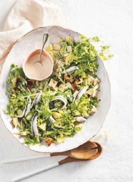 INGREDIËNTEN VOOR DE DRESSING 4 el Griekse yoghurt 0% vet ● 2 el yogonaise ● ¼ teentje knoflook, geraspt ● 1 tl Dijonmosterd ● 1 el citroensap ● 2 ansjovisfilets, fijngehakt ● 1-2 el olijfolie ● peper en zout