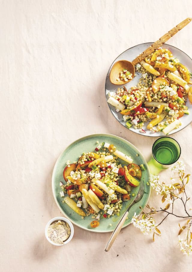 INGREDIËNTEN 500 g witte asperges ● 100 g parelcouscous ● 1 kleine komkommer, in blokjes ● 150 g gekleurde cherrytomaatjes, in vieren ● 50 g radijsjes, in blokjes of partjes ● 50 g steenfruit (bijvoorbeeld nectarine of perzik), in partjes ● 50 g feta, in blokjes ● 10 g verse dille, grofgesneden ● 50 g boter, ongezouten, op kamertemperatuur ● 1 el sumak ● zoutvlokken ● 1 el citroenrasp